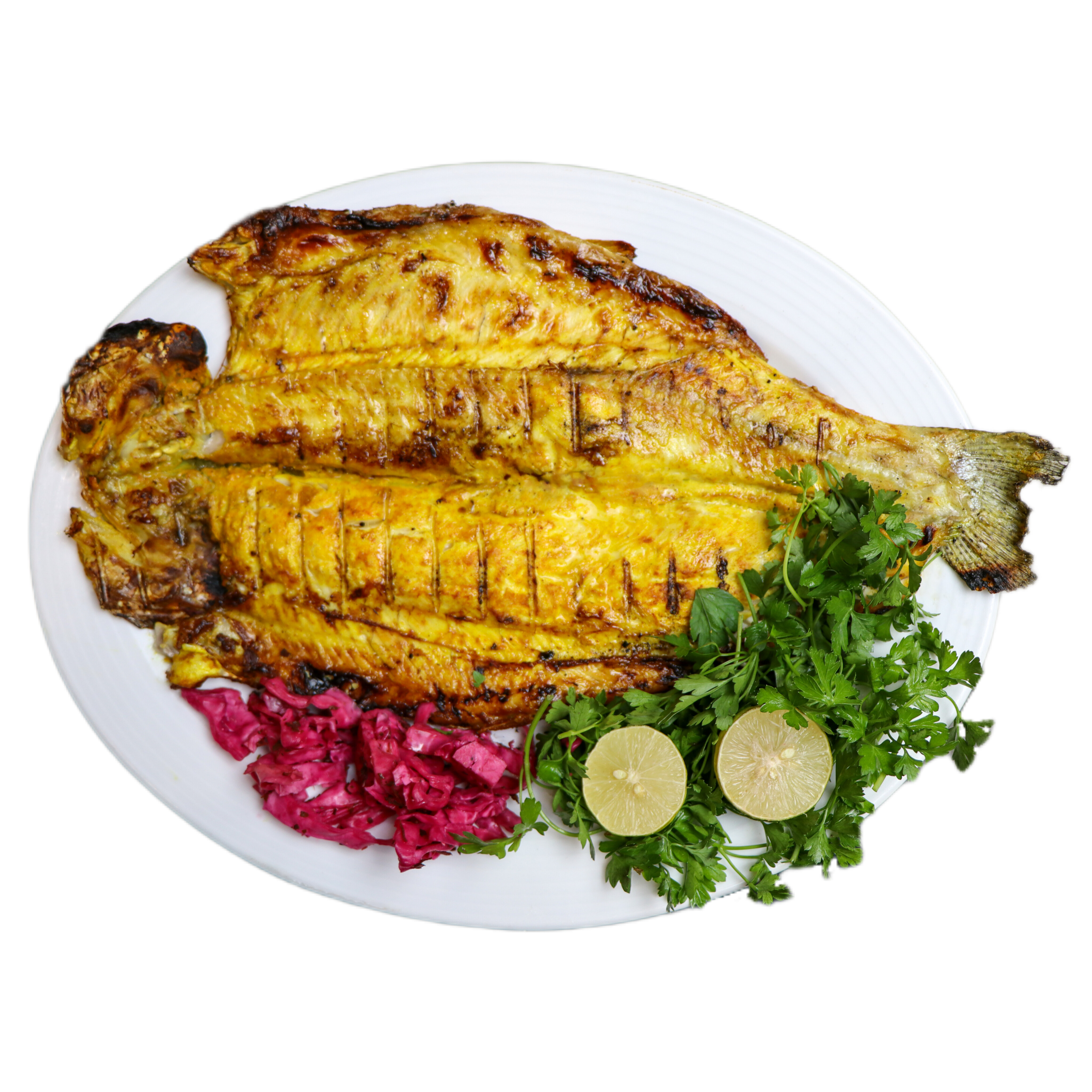 600 گرم ماهی قزل کباب شده، گوجه، لیموترش، سبزی، ترشی کلم