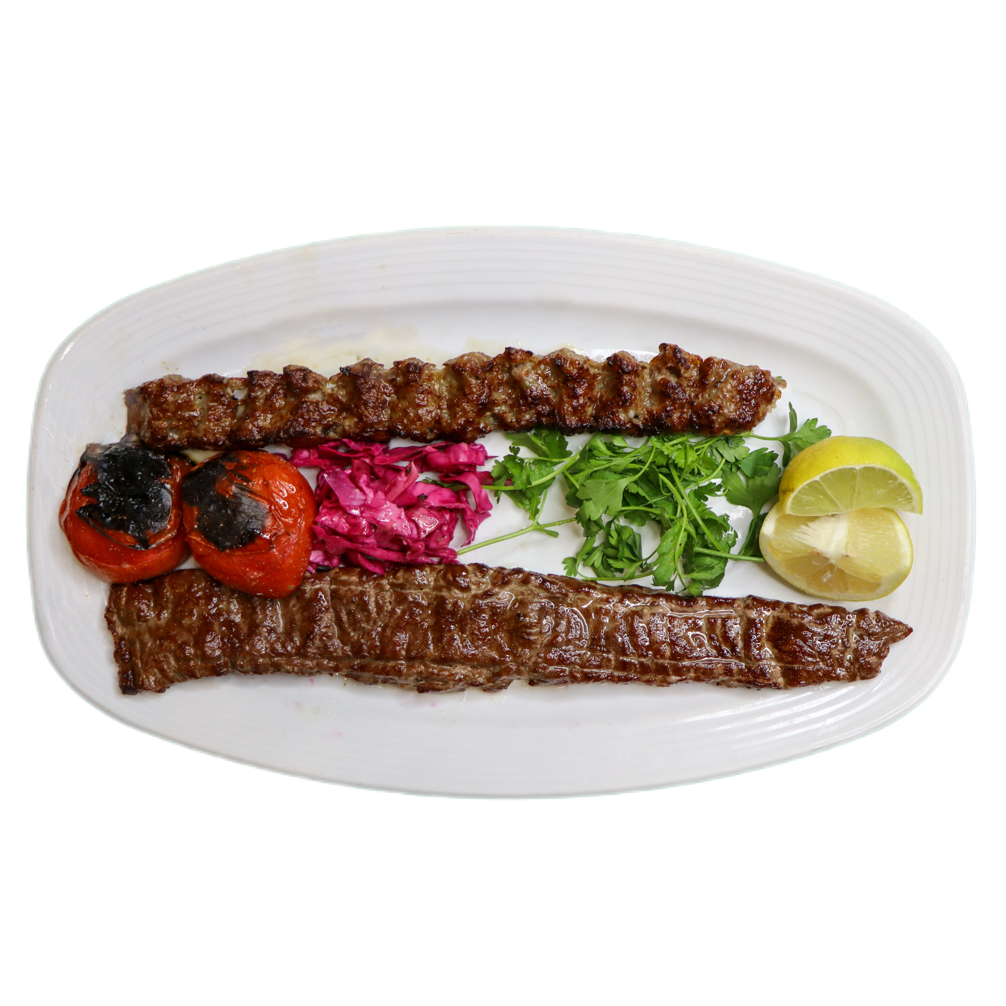 260 گرم گوشت راسته بره، یک سیخ کوبیده 170 گرمی، گوجه، لیموترش، سبزی، ترشی کلم